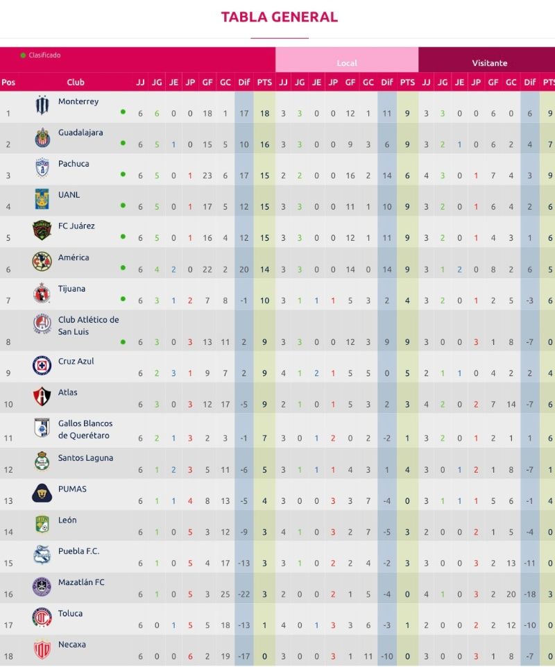 Rayadas se ha quedado con el liderato de la tabla con 18 puntos, seguido de Chivas, Pachuca en tercer lugar, Tigres en cuarto, Juárez en quinto y América en sexto. Por otra parte, los últimos lugares son Leónides, Puebla, Mazatlán, Toluca y Necaxa.