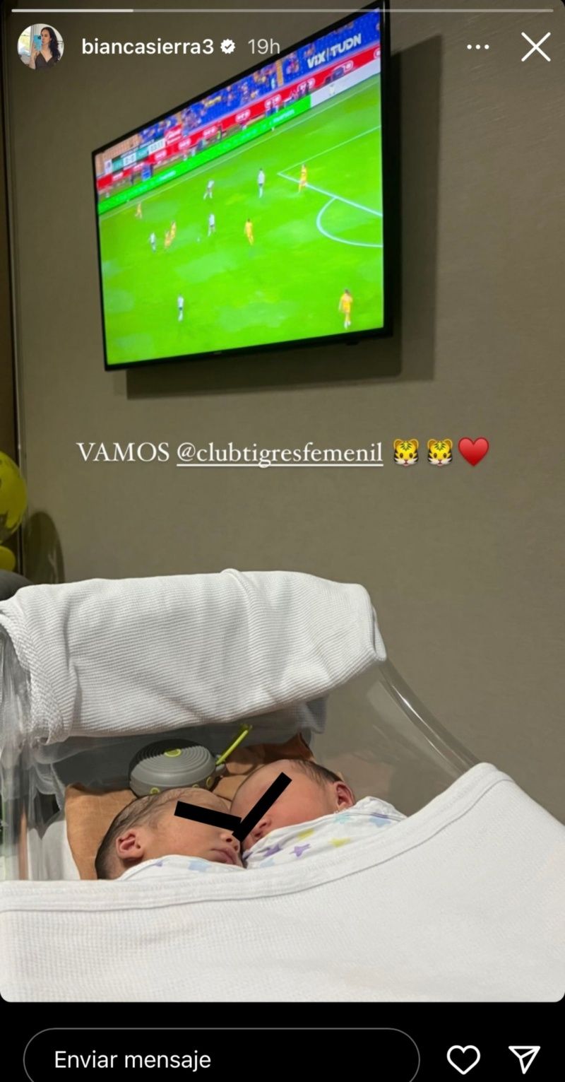 Bianca subió a sus redes sociales una historia en la que se puede ver a los bebés en su cuna y en el fondo el partido entre las Amazonas y Pumas. “Vamos Tigres Femenil”, escribió.