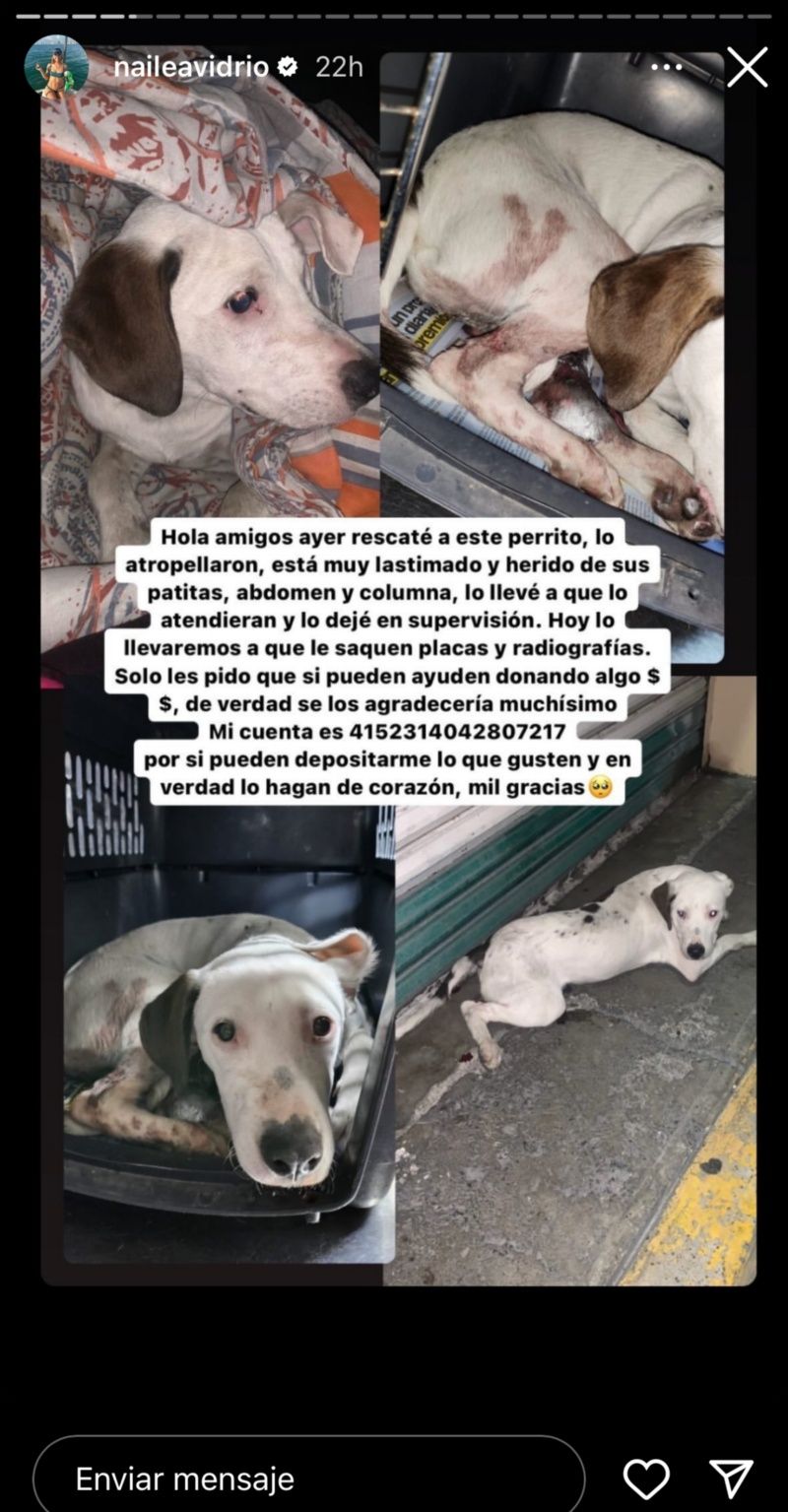 Ahora, por medio de sus redes sociales ha solicitado la ayuda a sus seguidores para que puedan salvar a un perrito que fue atropellado, que se encuentra en malas condiciones y que necesita cirugías, por lo que pidió apoyo para reunir dinero y pagar los gastos médicos.